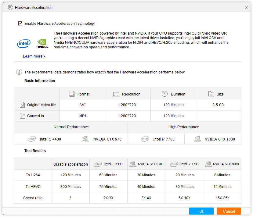 The conversion speed of HD Video Converter Factory Pro is extraordinary. It utilizes your GPU and CPU to ensure maximum video quality and conversion speed. If your CPU supports Intel Quick Sync Video or you have NVIDIA Graphics Card, You will probably get the maximum from this software. Because It supports Intel QSV and Nvidia NVENC/CUDA hardware acceleration.