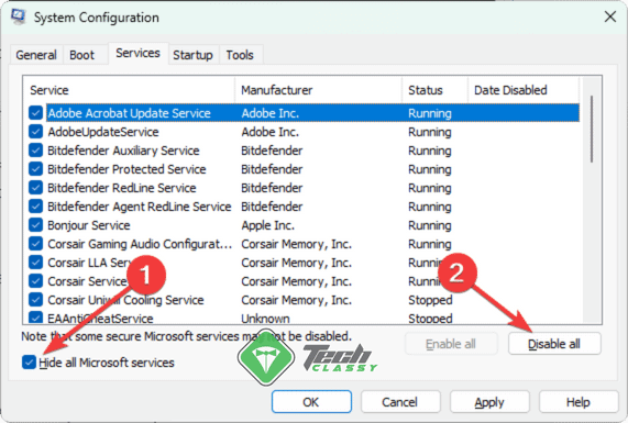 - Check the Hide all Microsoft services box and click Disable all.